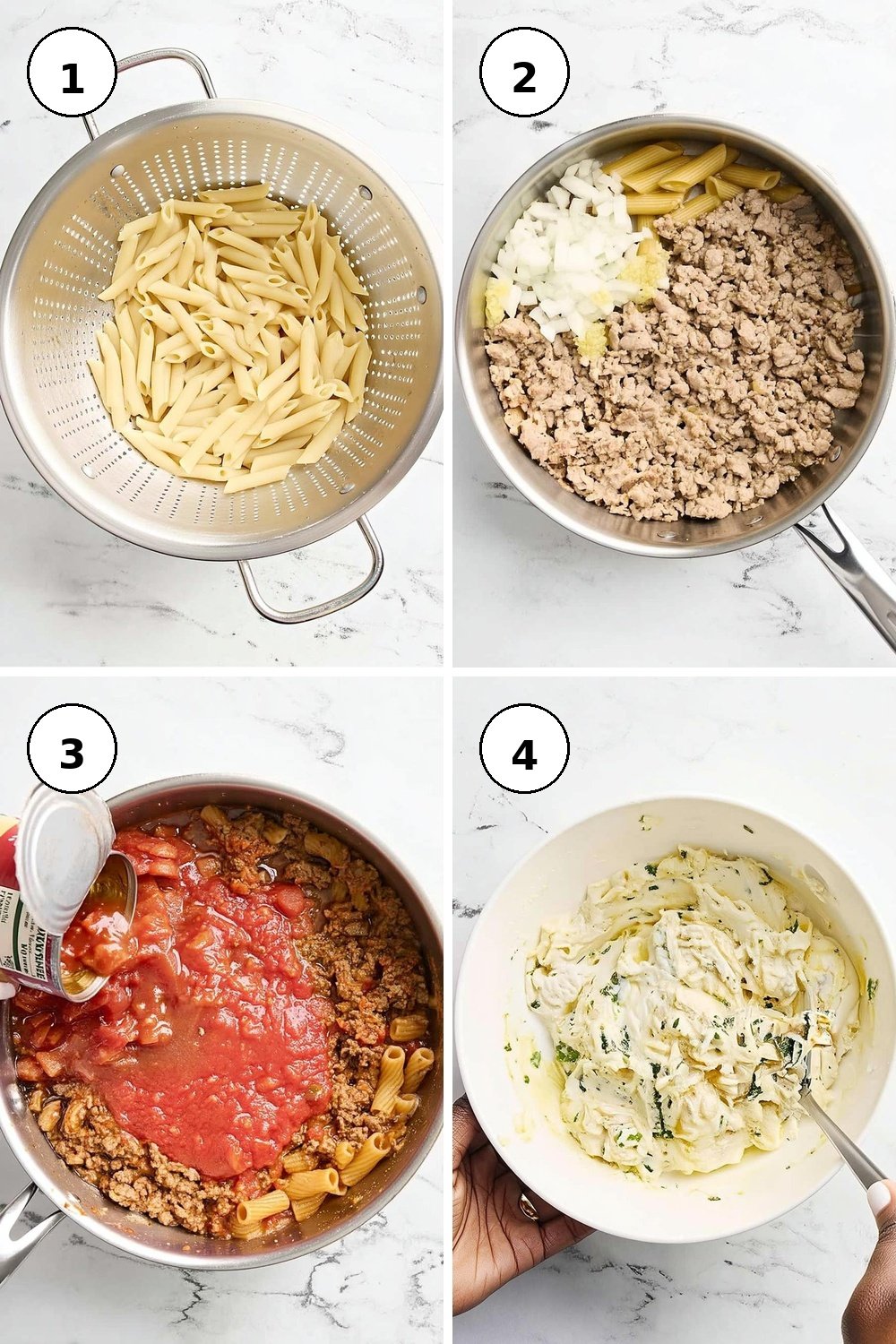 - Preheat your oven to 350°F. Bring a large pot of salted water to a boil. Cook the mostaccioli until al dente, ensuring they maintain their structure when baked.