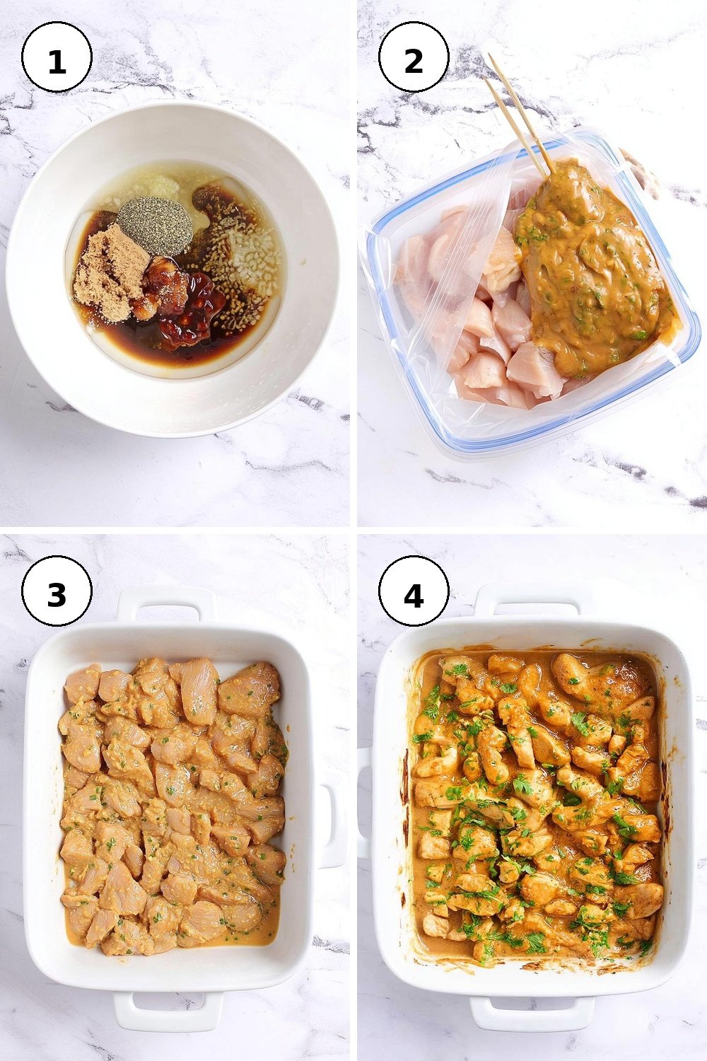 - Preheat your oven to 375°F (190°C) and lay the marinated chicken in a single layer in the casserole dish.