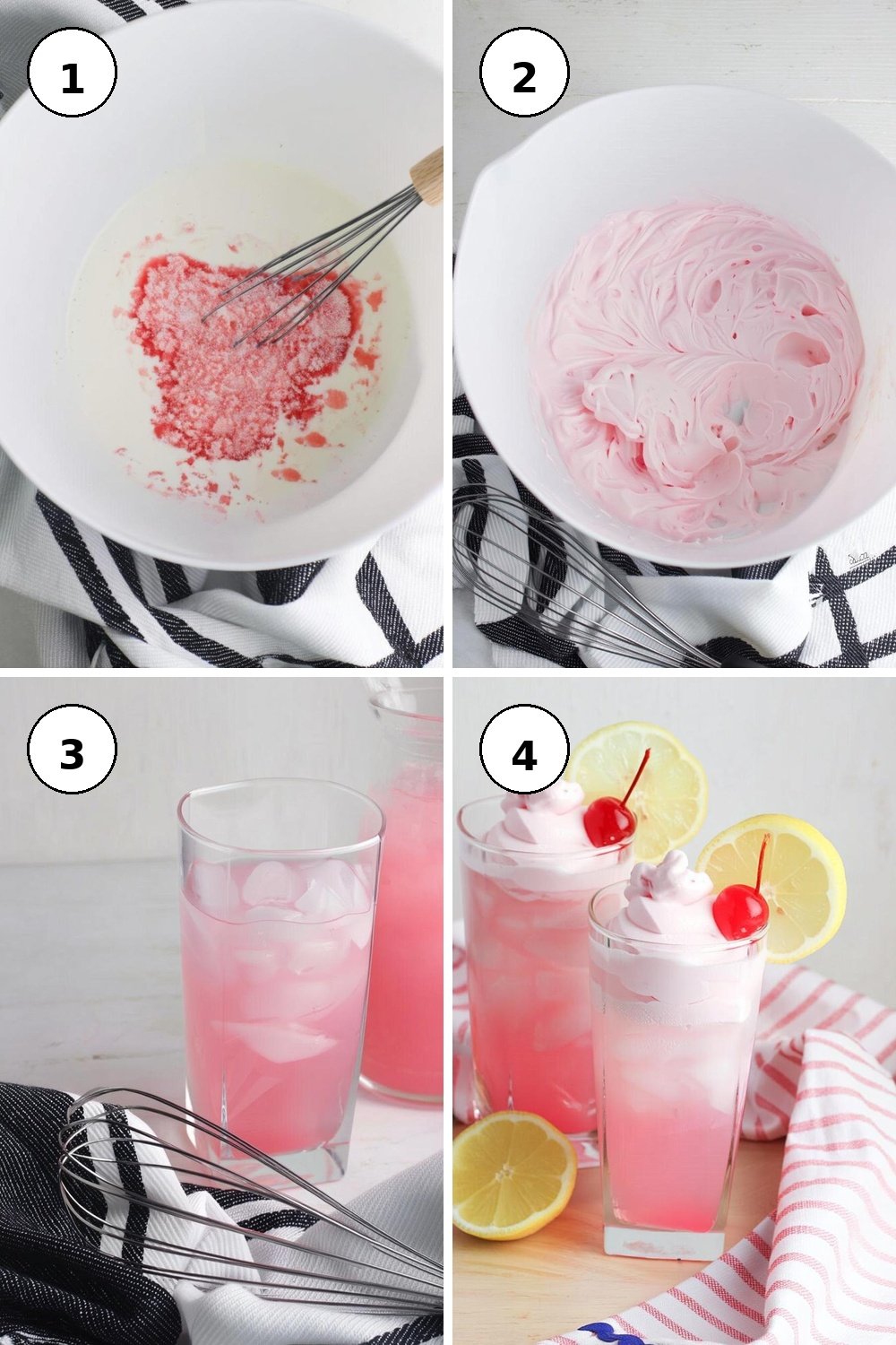 - Top each glass generously with the whipped pink lemonade cream and stir gently before sipping for a delightful experience.